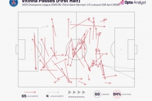数据统计显示,维蒂尼亚半场便完成了65次传球,而利物浦全队共计仅82次。